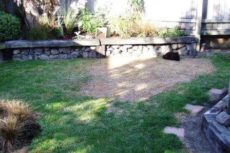 The wheels are in motion for my newest garden bed. This stroke of brilliance came to me a week or so ago. Here is Ninja, surveying the site of the new garden bed. I marked out my desired shape with some rope, then sprayed the lawn and cut around the outline with my spade.