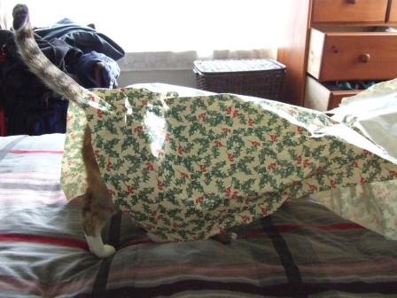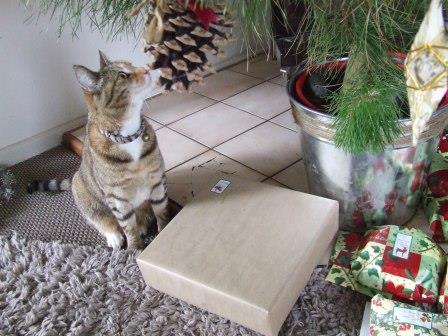 Hanging pinecone cluster that I made for the office. There’s probably a proper name for it…Nala checks out the tree.Nala’s present is playing with the wrapping paper.A satisfied cat.Christmas Day dinner at The Husband’s Parents’ place.Christmas Day Eurasian dinner, complete with turkey, ham, beef, yorkshire puddings, awesome salads, roast veges and Chinese dumplingsDessert time, some time after 5pm! Lemon tart, beetroot cake and pavlova, which got swooped on and didn’t make it to the table.The Little Sister-in-law’s special flowering tea.Boxing Day Christmas dinner (night dinner) with my family.My Christmas tree.