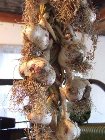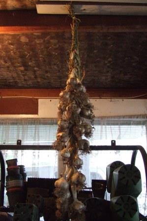 After drying out in the sun for a few days, and on the porch when it rained, it was time to hang the garlic. I was going to google how to plait it. I have previously just hung it in a bunch. However, while I was potting up plants, a mysterious rustling noise turned out to be The Husband, plaiting my garlic on the back porch. Turns out he’s the french braider of the pair of us. I’m feeling a bit manly right now. One day I’ll learn, if only for the garlic. The Husband did a pretty good job too, and hung them in the garage to dry further. I’ll save the biggest ones to plant this winter. And thus, the cycle begins…