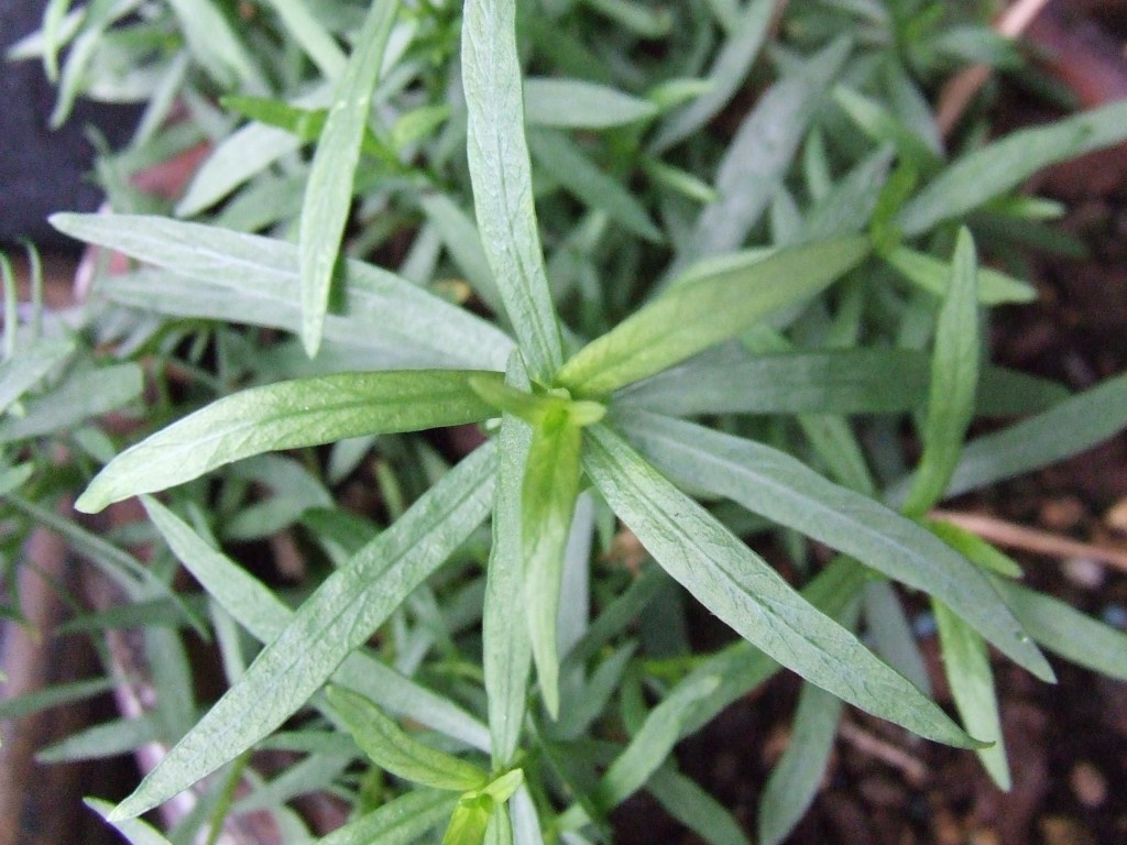 Perennial. French tarragon is the proper culinary tarragon, being far superior in flavour to the plain but commonly-sold Russian tarragon. The reason French tarragon is harder to come by is that it doesn’t set seed, so has to be propagated more slowly by division or cuttings. It has a strong licorice-like flavour that is useful in fish dishes and dressings. It seems to be very happy growing in a pot. Goes dormant over winter.