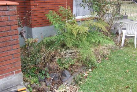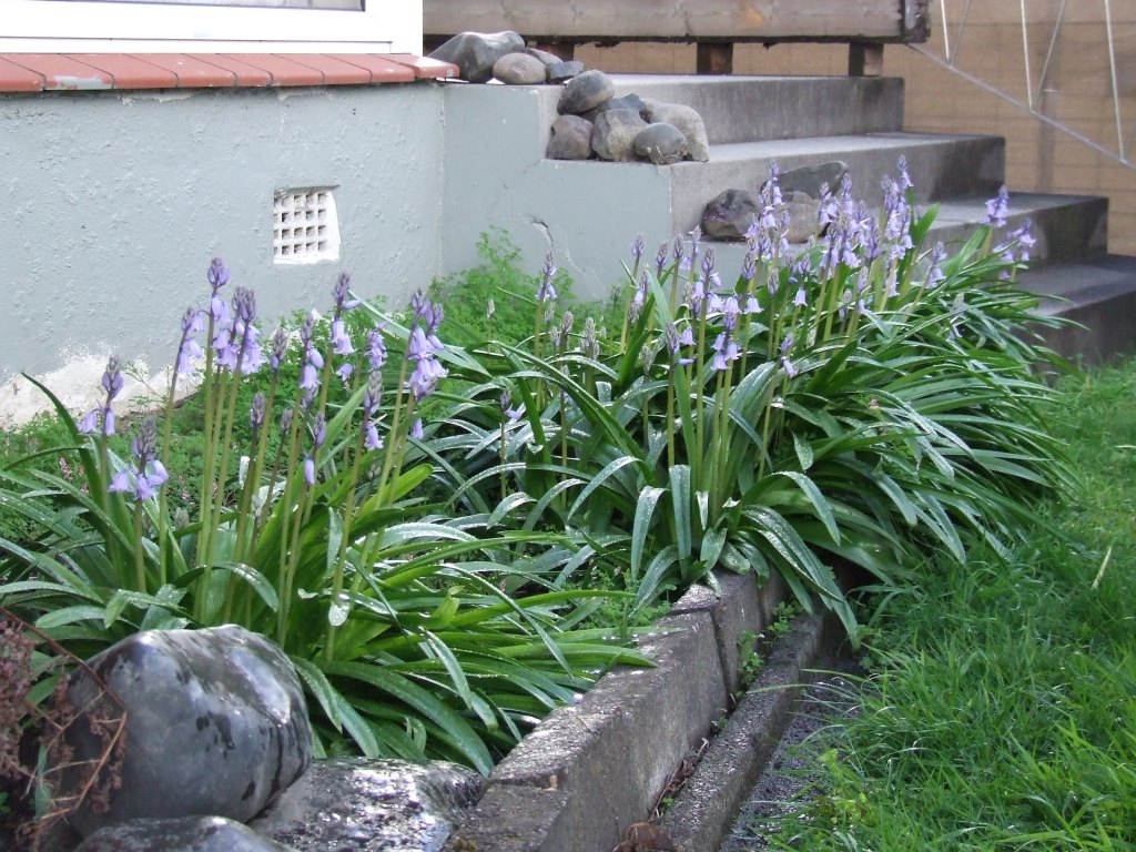 Everything I’ve planted in here is a New Zealand native, except for the silver and purple-leaved ground cover, Ajuga ‘Port Wine’. The native grasses (sedges) are Carex dissita (Forest Sedge), the larger green sedge; Isolepis cernua (Fiberoptic Grass), the small green sedge/reed; and Carex tenuiculmis, the red-brown sedge. The two shrubs are, well, I’m not entirely sure. When I bought them I knew they were one of the native coprosmas and was told they were Coprosma rigida, but I’m not entirely sure about that. Especially since the assistant got the species of flax I was also buying wrong, and I had to correct him. It pays to have plant knowledge! I think they may be Coprosma tenuicaulis, but they haven’t produced any berries yet and I’m not skilled enough with my small-leaved coprosmas to be sure. In any case, I like them. There are also a few dwarf flaxes in there, Phormium ‘Bronze Surfer’, and the pre-existing, exotic but seasonal bluebell and snowflake bulbs, which will rise from the ground in late winter and spring.