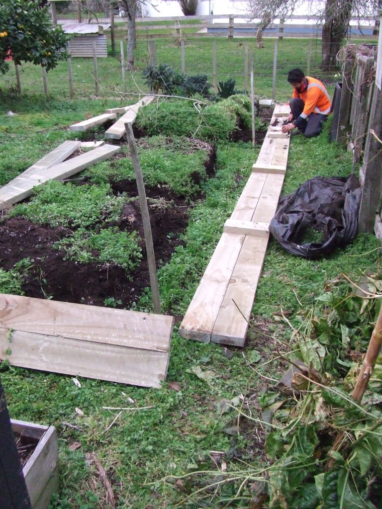 The arrival of the timber spurred The Husband into action and he has built three sides of the first vege bed so far. It is no mean feat. Each piece of timber was 150 x 50mm and 4.8m long and he has cut some of the pieces to form a bed approximately 1.6m wide by 8m long. Yup, that’s a whopping long vege bed! And the sides are two timber widths high too, giving a nice workable height of 30cm. This bed sure won’t be going anywhere in a hurry. It is H4 treated pine so it should last for a long time in contact with the soil.