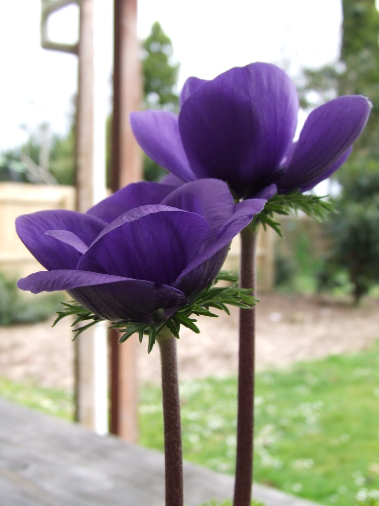 And now for some cheerful colour to brighten up a rainy day like today. My blue Anemone coronaria‘s are flowering so I’ve put the pot on the outdoor table to enjoy. Happy gardening!
