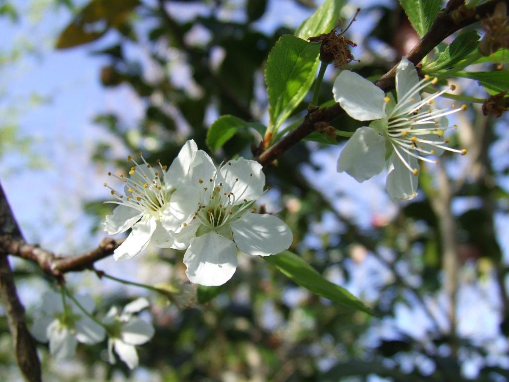 There is the squished fruit tree, right next to the potting shed, which I strongly suspect is a plum. It commenced flowering and leaf opening around the same time as my potted ‘Billington’ plum and the flowers look quite similar.