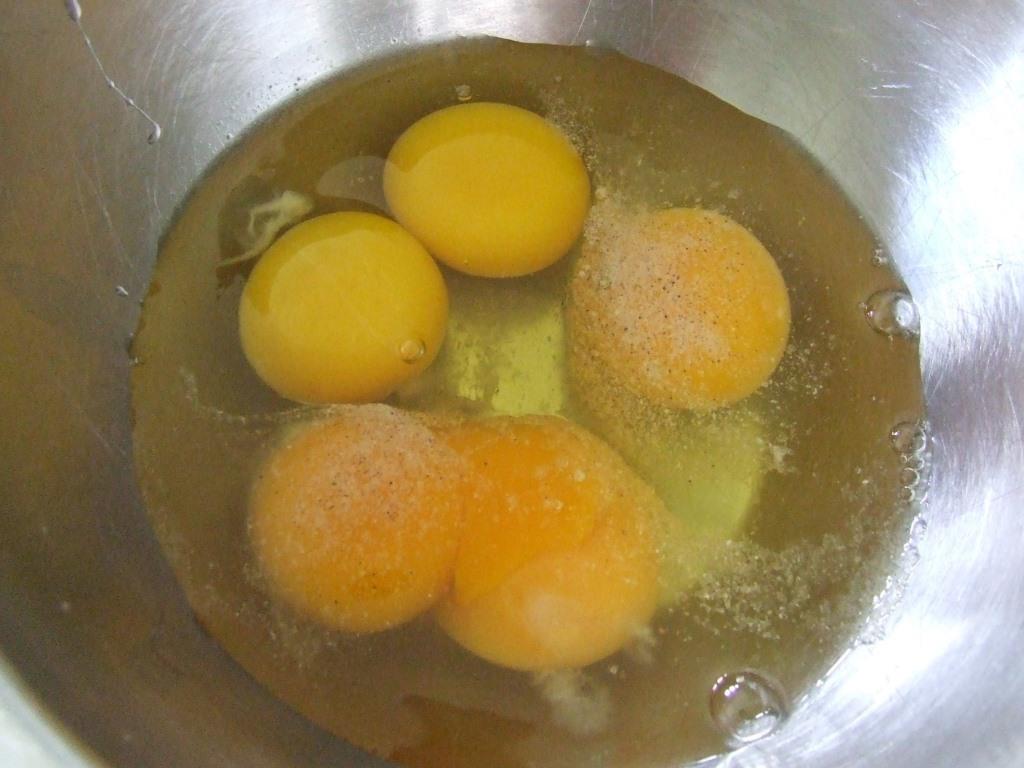 I was planning to fry the eggs so I could take photos of any double-yolkers, but before I could say, “Oi!”, The Husband had cracked two of them into a bowl and seasoned them for an omelette. Not quite the same photo effect I had in mind. I saved the other one for frying the next day, and all three were double-yolkers! It’s not surprising really, considering their size.