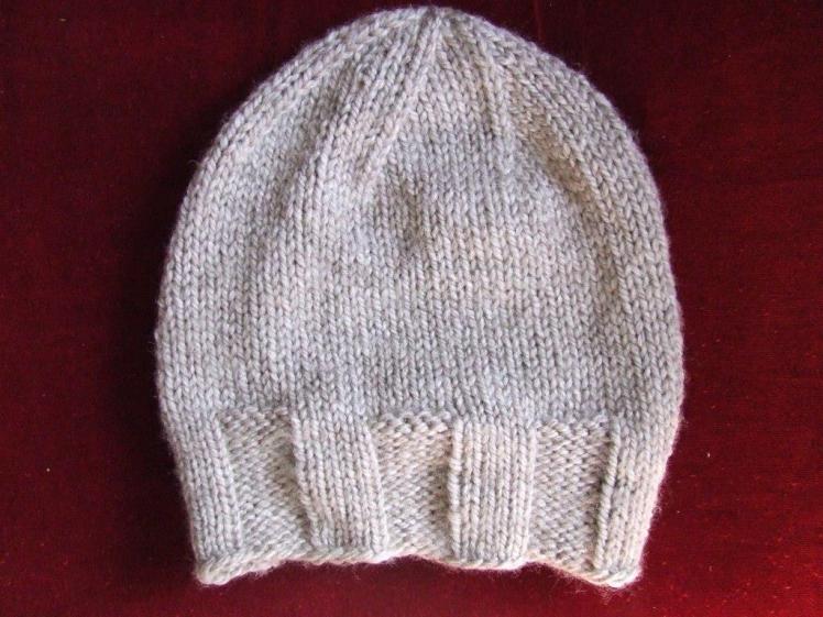 I managed to finish the hat on the last night of our 11-day holiday, which was fairly impressive considering I had a small child to look after and lots of family and friends to catch up with. Towards the end I realised the hat seemed to be tending towards the biggish end of the scale, in terms of height. I considered The Husband’s head and kept going because I just couldn’t tell how it would fit until I was finished. It depended on whether it was worn with the ribbed border folded up or not. Once finished, The Husband had to try it on. With the ribbed border down it wasn’t snug-fitting in terms of height, but a little slouchy. With the ribbed border up it was too small. I decided that it was good and finished, partly because the slouchiness looked quite good on The Husband (sorry, no photo at the moment) and partly because I did not want to re-do a big chunk of the hat. It was finished!