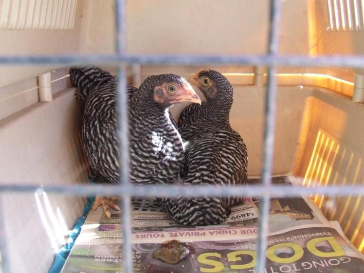 The new feather children have landed! Things are going to get interesting. I spent a large chunk of the day yesterday preparing for their arrival. They are two barred Plymouth Rock pullets, aged around 9-11 weeks. Due to the size difference, they need to be separated from the other two until they are bigger.