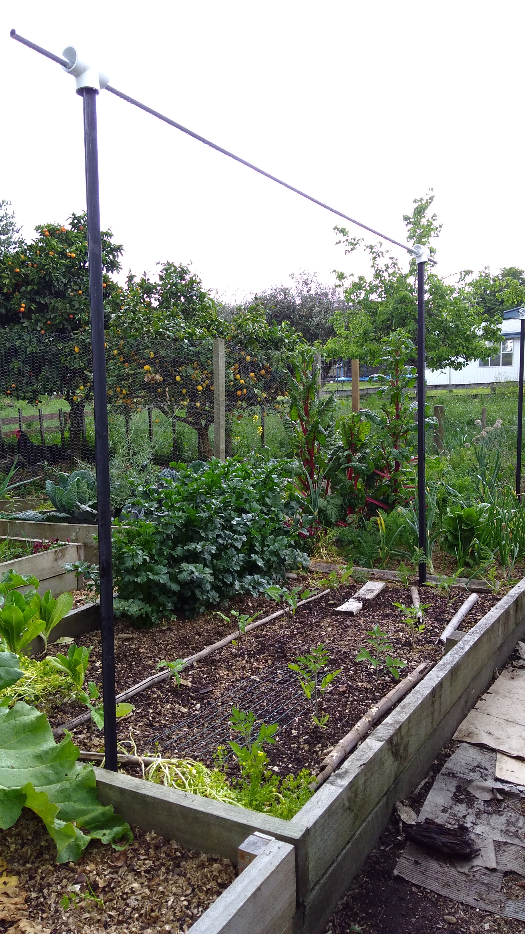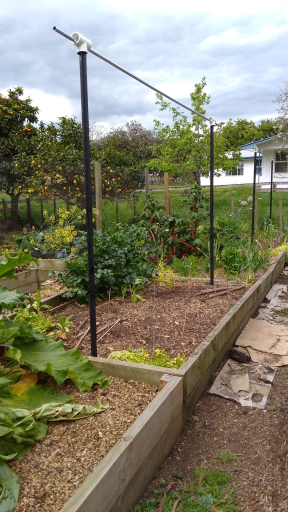 What we’ve got is 2.4m (7.9ft) metal standards or Y posts, a 50mm (2in) PVC tee on top of each one and 2mm (3/4in) metal conduit (pipe) sitting horizontally inside the PVC tees. There will be a length of string tied onto the pipe for each tomato plant so the plant can be wound up it. Here’s the link to the video where the idea came from, by Josh Sattin. Note that we’ve used wider metal conduit, which will be stronger, and bigger PVC tees because 50mm ones are what fit over top of our Y posts.