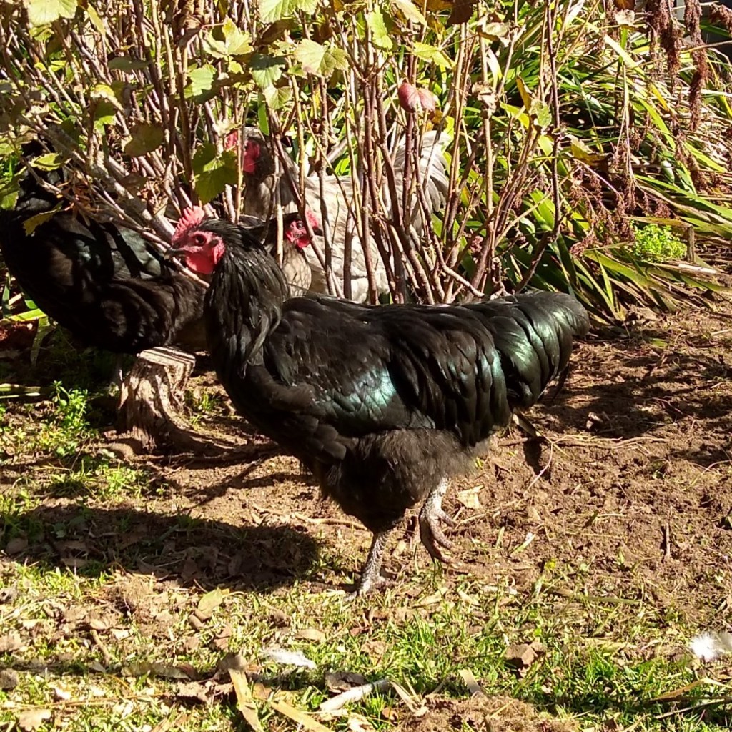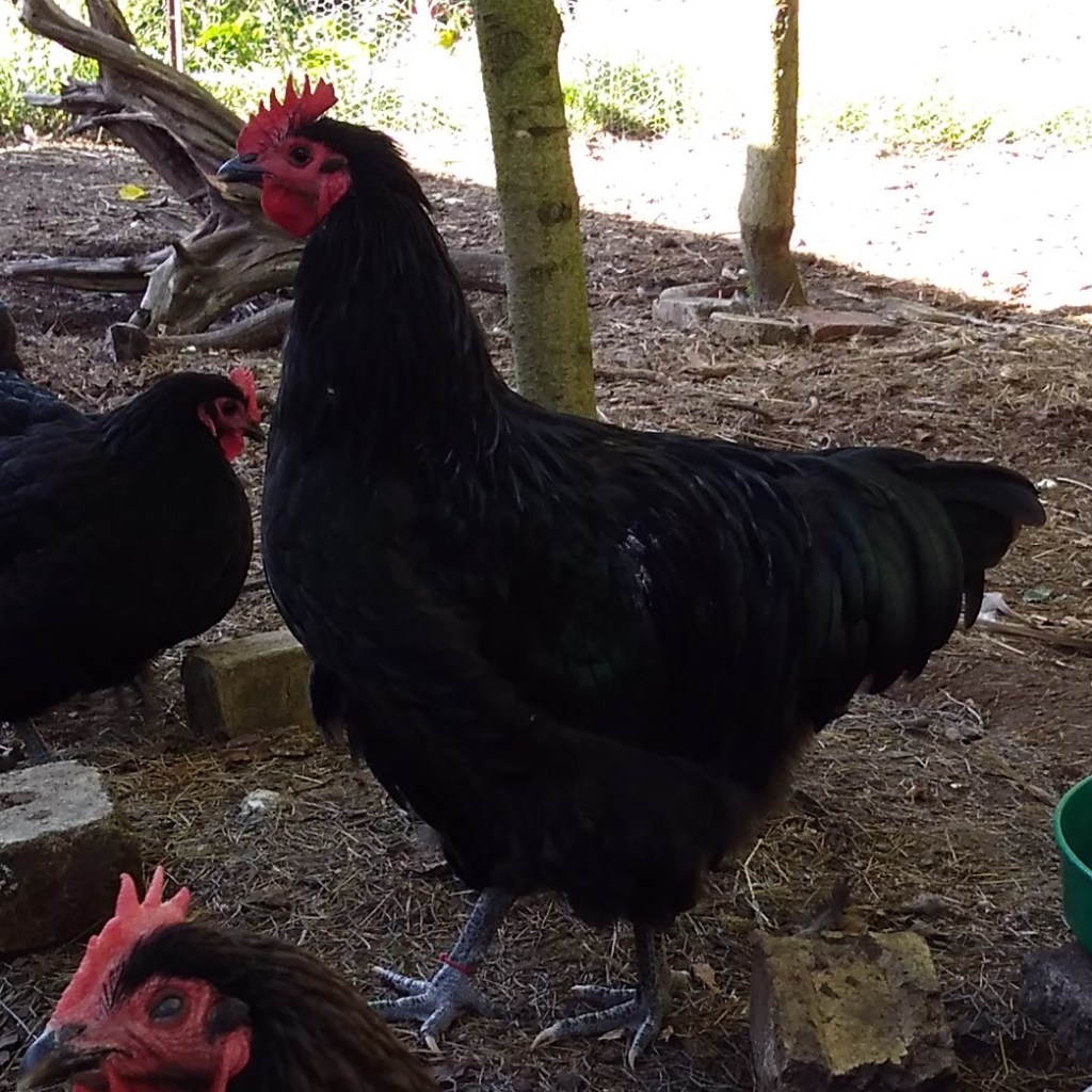 In terms of cockerels, there are the two remaining older black Morpheus boys. Well, there were until this morning. They were quite similar and quite beautiful but I chose to only keep one. I opted for the one who seemed to have better overall type, a better comb, a more curved tail and less fluff in the trousers. His hackle feathers on his neck haven’t grown out much yet so his neck looks lanky, but he’s coming along nicely.