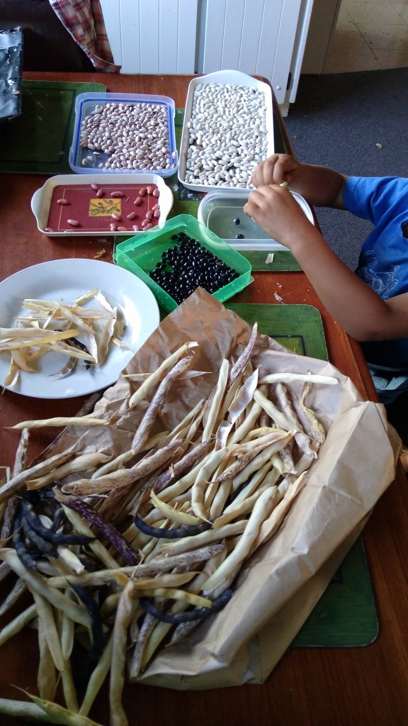 The bean shelling station has been pumping, with The Little Fulla taking on the position of Head Bean Sheller. I have saved beans from pods that were on plants furthest away from other varieties for seed. I’m looking forward to using and tasting the two new dry bean varieties, ‘Blue Shackamaxon’ and ‘Selugia’. The ‘Henry’s Climbing Butter’ beans are quite large but there aren’t many on a plant. So far I have used them fresh, chopped up into curries and some will be going into the freezer.