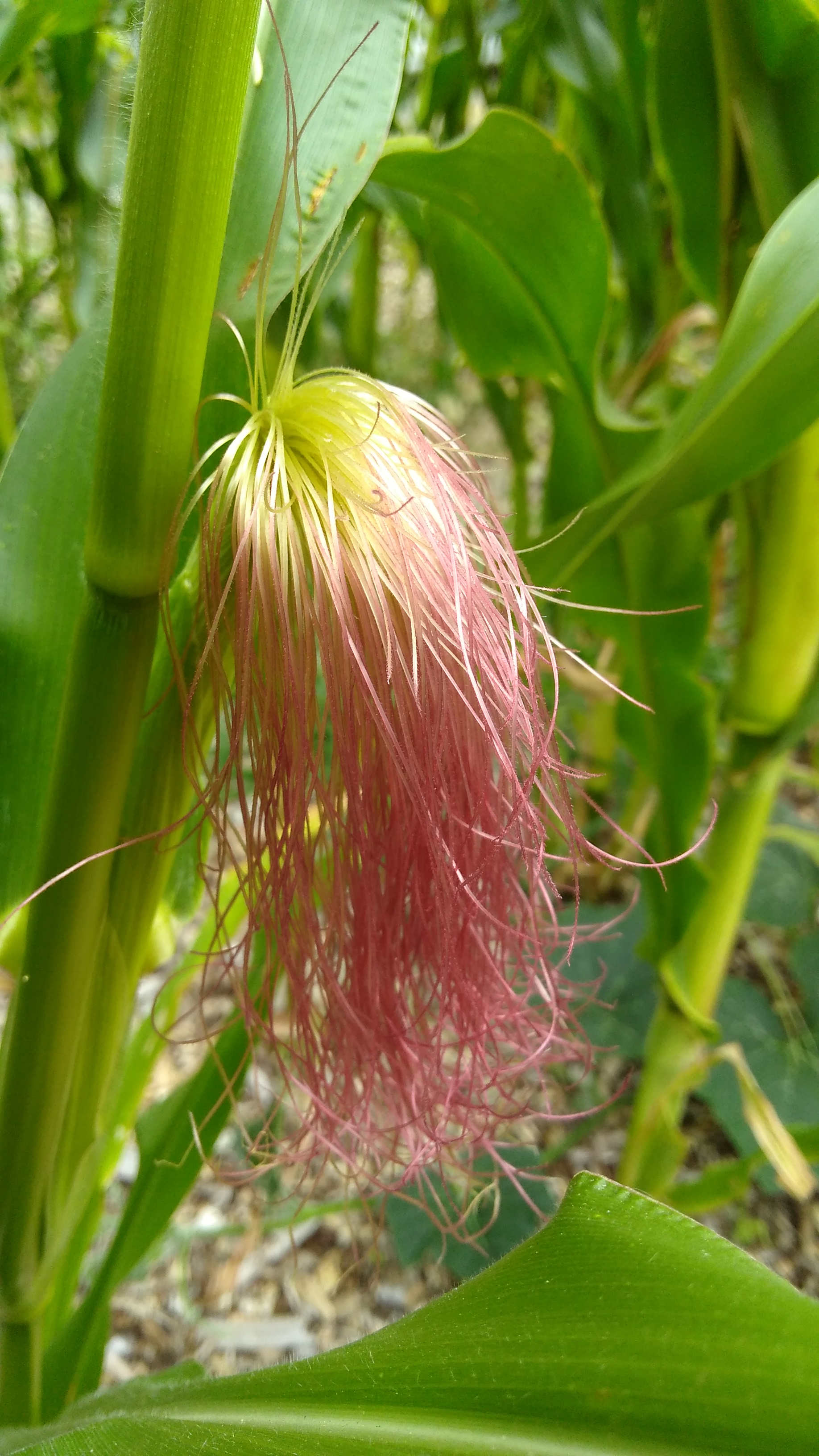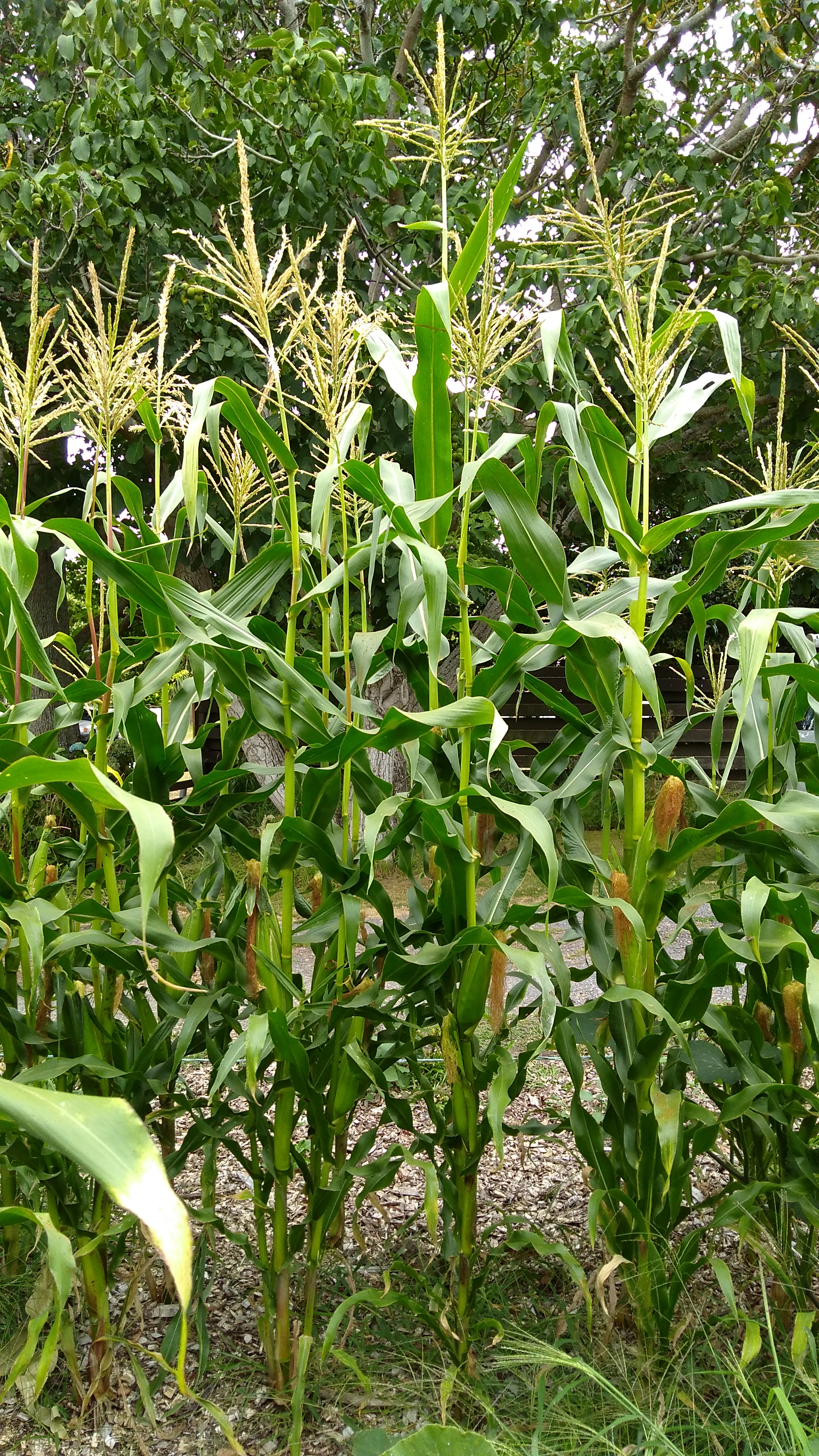 The corn is in its prime now. It has done so well with compost and bark mulch. The variety is ‘Country Gentleman’. The plants are very tall and elegant, with most having two ears of corn and some three or even four. They aren’t quite as sweet as the common hybrid sweetcorn but they are more creamy and filling and we like them a lot. Time will tell how many we eat and how many will have their kernels cut off and frozen for later use. It’s hard to say with two corn nutters in the family.