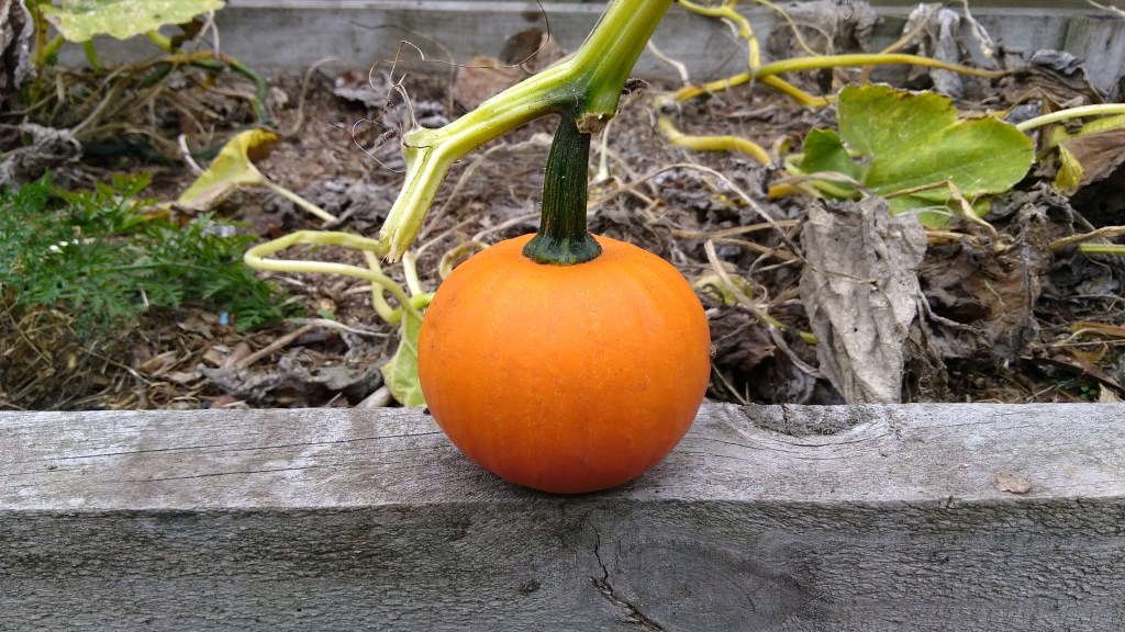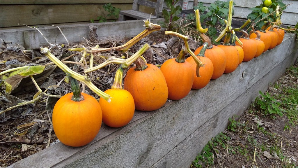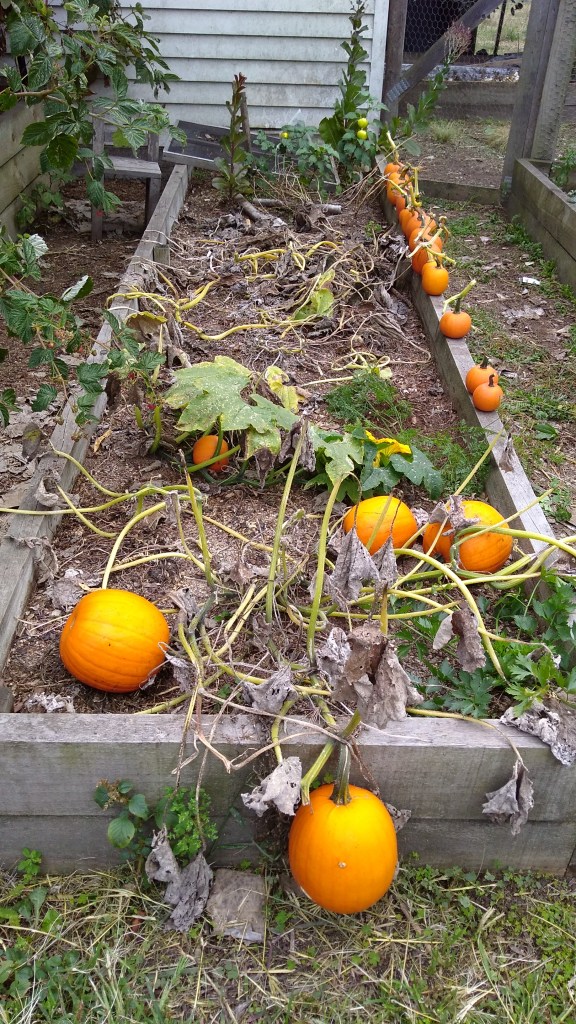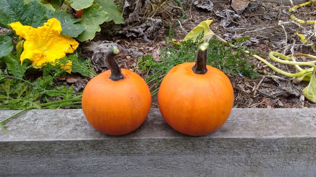 Here’s what went down with the Wee Bee Littles. I planted four seedlings grown from the forgotten seed line in the Veggie Garden. Plants #2 and #3 had to be replaced because they got chomped by slugs or snails. A common problem. Plant #1 was the first to start flourishing. I felt nervous as it started flourishing a bit too much for a Wee Bee Little pumpkin. It’s growth habit was not compact and the fruit started getting bigger than they ought to. At that point I pulled off all the remaining flowers and laterals. It could stay and keep ripening its four pumpkins but it could not produce any more flowers. No fraternising with the others.