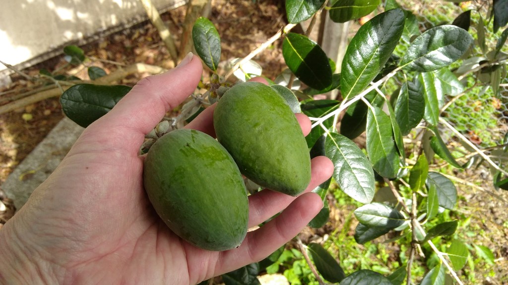 We’re getting a small amount of big feijoas off our young ‘Golden Goose’ tree, which is nice, since the older tree is producing progressively smaller and more useless feijoas thanks to my lack of pruning. They all taste good though.