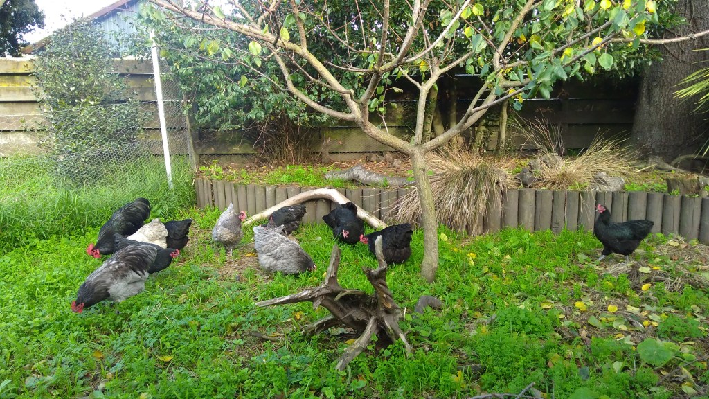 The chickens are enjoying the change to the other pen, swapping a slippery, muddy feijoa mess for at least some green stuff.