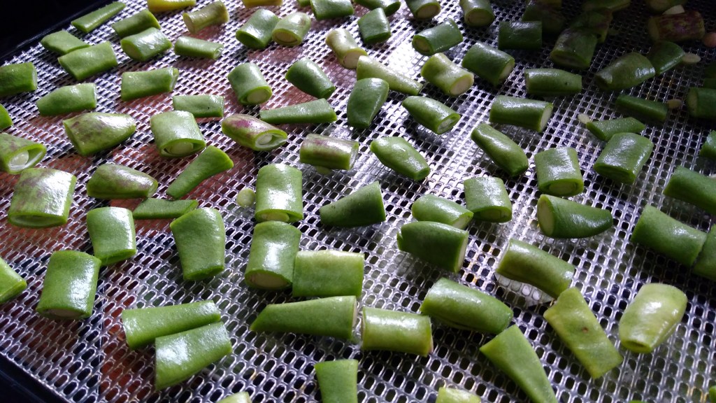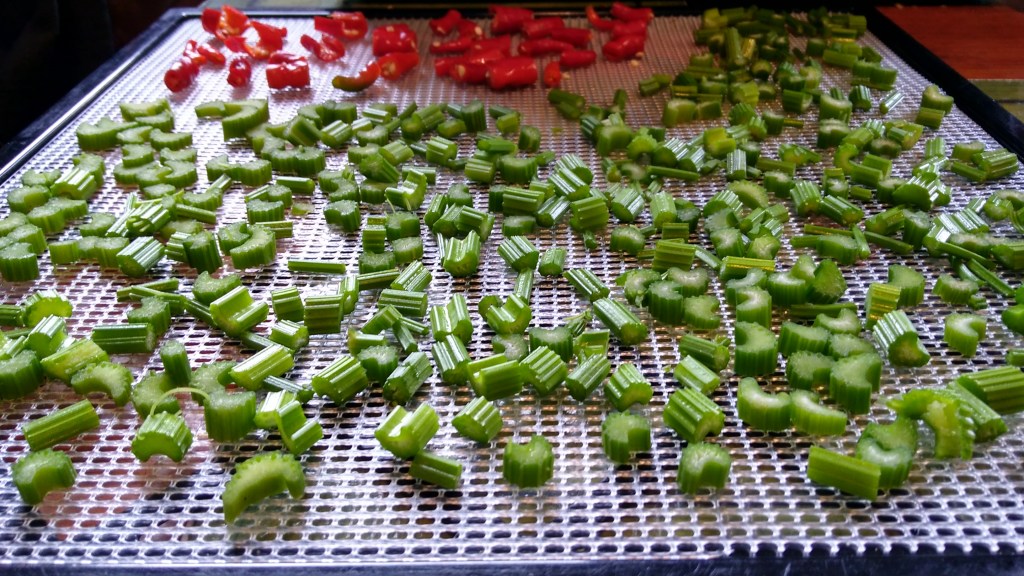 We’ve harvested a bunch of green beans from the second round of bean crops and some I’ve left, trying really hard to get to the drying stage as the temperatures plummet close to or just at freezing some mornings. Generally, May has been quite mild so that has helped the beans. I decided to dehydrate some to save freezer space, so The Little Fulla and I sat at the table and chopped them into pieces. I needed to dehydrate the last few cayenne peppers, then we filled the last of the trays with chopped celery. I figured I should dry some while there’s plenty in the garden, as it can then be used in soups, stocks and meals at any time.