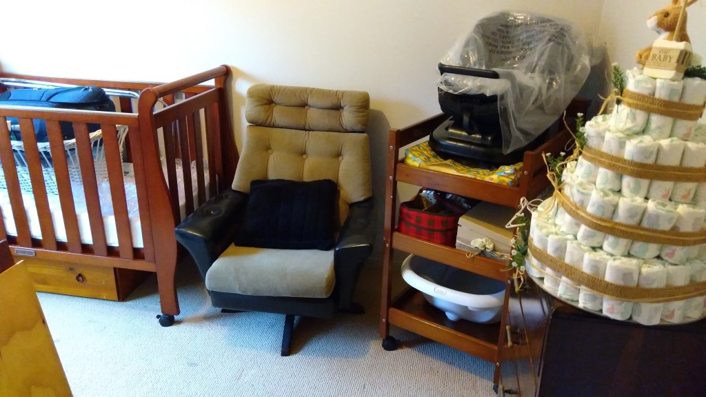 I have continued to chip away at clearing and organising the baby’s room. It has been a big task, but something less physically demanding. Most of the time… Getting everything off the bed, having the guys dismantle it and putting up the cot was a big milestone. One side of the room is pretty well sorted with the baby things, including the armchair that was relocated from The little Fulla’s room. The other side of the room is the work-in-progress, with the desk, the bathroom sink, toilet and mirror still waiting to be installed and a few last things that need to be sorted.