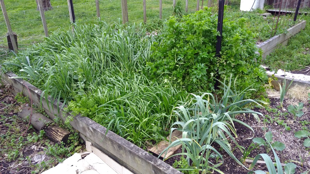 The Front Plot isn’t quite as abundant-looking as I was planning it to be. The first row is doing well, with garlic and kale. The second row has a small amount of garlic up the back and the rest was sown in an autumn cover crop. It was. I did it myself. But I think the birds must have eaten most of the seeds as very few plants actually grew. There’s nothing wrong with the seeds as the cover crop I sowed in one of the raised beds grew splendidly.
