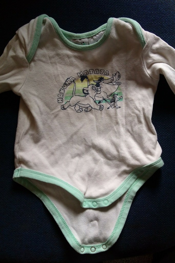 We all know baby clothes are pretty cute, but we have a onesie, a second-hand onesie, that is one of my favourite things. It isn’t the prettiest one. It has a picture from The Lion King and says, “Hakuna matata.” You can’t stay down or frustrated with a piece of clothing like that on your baby, because you can’t not start singing, “It means no worries! For the rest of your days…” Oh, gotta love that onesie. Sadly, it’s too small now.