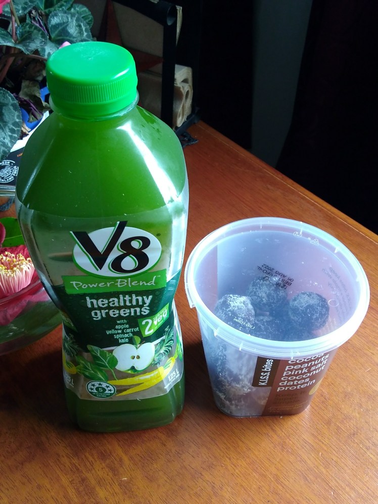 Food is also a favourite thing. Any food will do when I’m feeding a hungry baby. The sooner it gets in my face the better. I have a particular fondness for energy balls, my favourites from the supermarket being KISS bites. I also discovered V8 Healthy Greens vegetable juice when I was craving energy from green vegetables but couldn’t manage to pick and juice my own. You just need some things that you can grab and consume quickly.