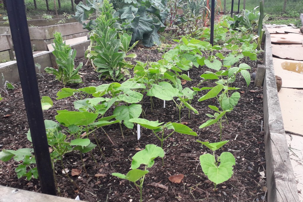 Climbing beans and bush beans. No strings have been hung in this section yet.