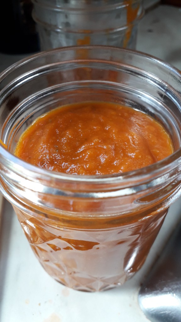 Since we can’t presently fit any more big bags of tomatoes in the freezer to process later, I used 5kg of them to make a pasta sauce. We usually only make concentrated tomato soup that we use for everything, but I thought it would be good to have a more finished product that we can use for easy meals like throwing into pasta. I had my own ideas about what I wanted to put in it, plus got some ideas from other recipes and wound up making my own recipe. I don’t know that it’s passata or marinara or spaghetti sauce, as everyone has different names for tomato sauces and things, so I am calling it tomato pasta sauce. I wrote everything down so I could change things next time if I wanted to. The colour is more of a dark orange due to there being lots of yellow or orange tomatoes in it. It is very nice and so far we’ve used it in lasagne to shorten the process. The rest is in the freezer in 8 oz (236 ml) jars or 1/2 cup logs. The Husband has made more tomato soup too.