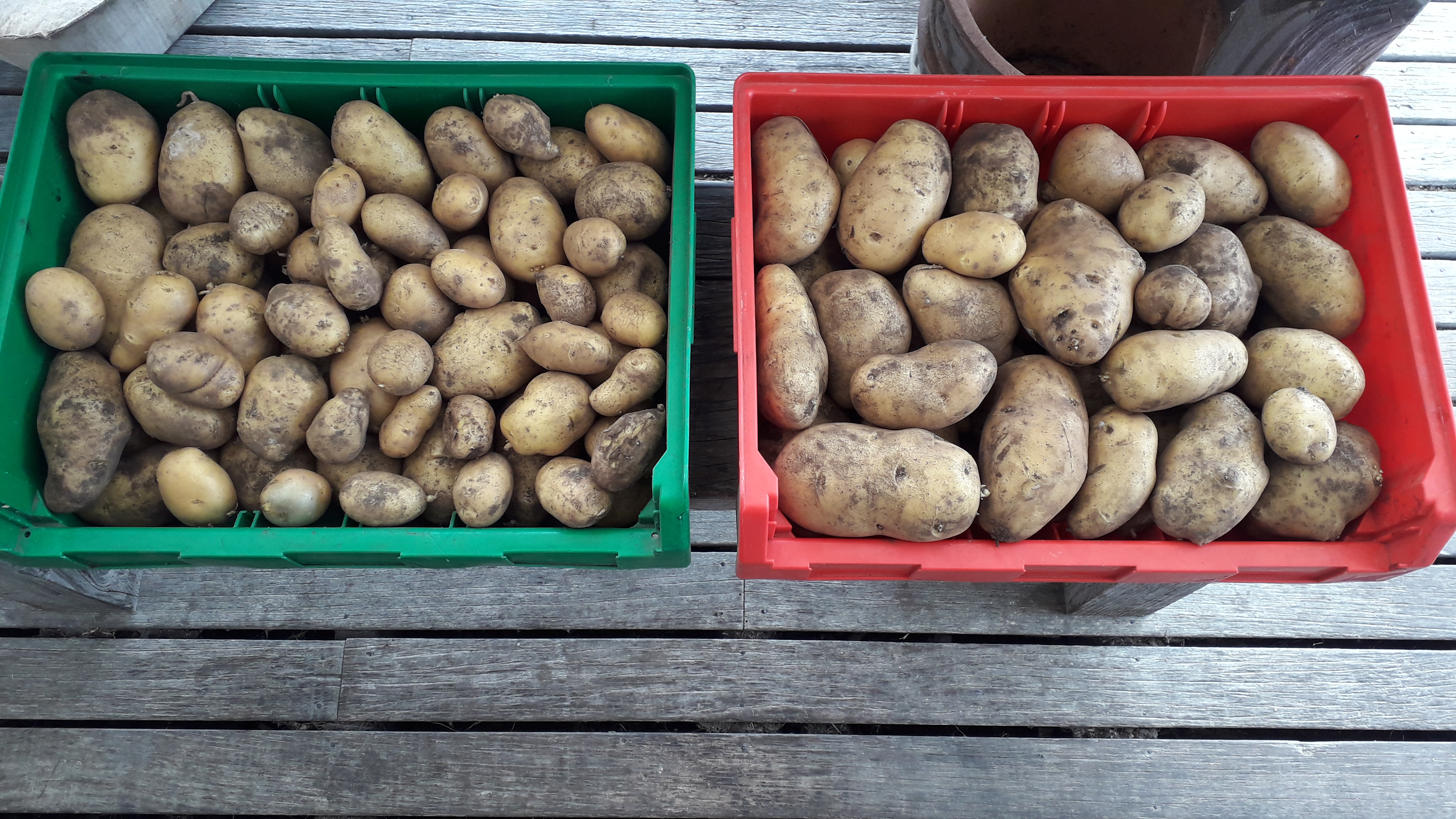 The row of Agria potatoes in the Front Plot has been harvested. The Husband and The Little Fulla got going with harvesting and I finished it off after I’d sown my brassica seeds (later than is ideal). The plants got blight earlier than usual and too much dryness throughout the season so the harvest wasn’t as big as it could have been. However, the potatoes look good and there are some very big ones there. The biggest one weighed 619g (1.4 lb). We can’t fit all the potatoes in the pantry anymore due to the flour buckets and other stored things. So there are crates of potatoes on the floor, covered with a cloth, behind Miss Scarlet’s high chair.