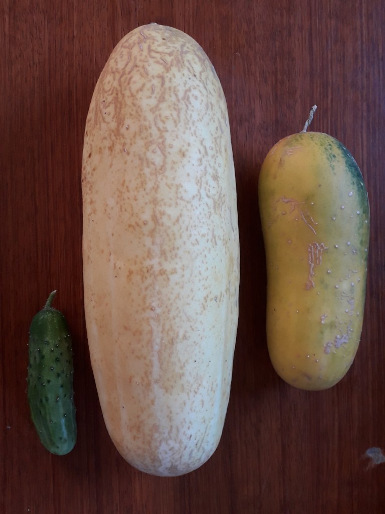 Here are two big old yellow cucumbers that I left on the plants to get fully mature so I could save the seeds. The biggest one is actually a gherkin, Homemade Pickles. I put a normal-sized gherkin (9cm long) next to it for size comparison. Yup. It was a monster! The other yellow cucumber is Tendergreen. It got a bit stunted from being low on the plant and having its end touching the ground.