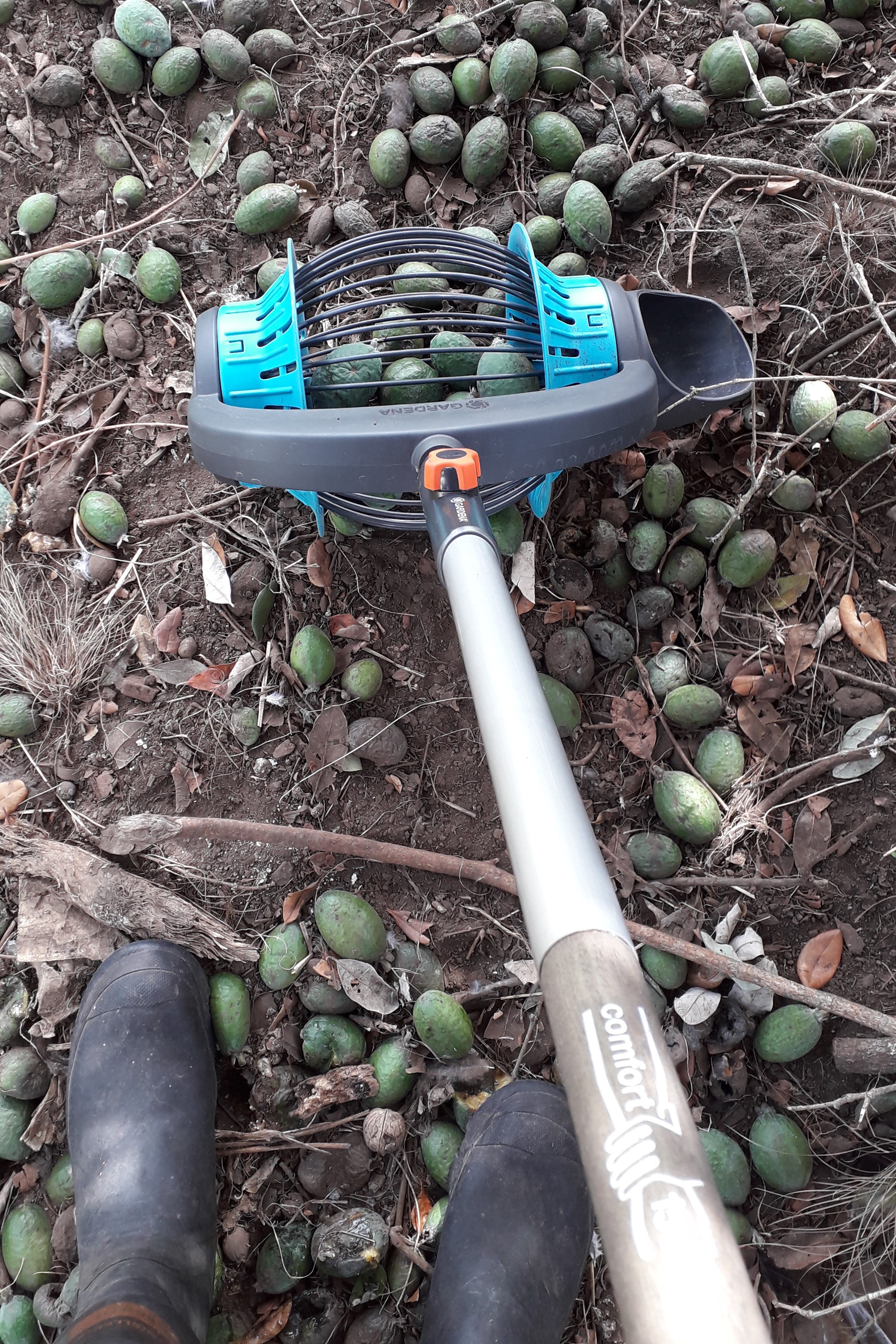 The feijoas have greatly improved in size since we pruned half the tree back hard. For the first time we can harvest our feijoas with the fruit collector. It is a basket attached to a long handle that you roll on the ground over the fruit and the fruit comes through the flexible basket wires into the basket. It was last year when I was trying to harvest feijoas and walnuts whilst pregnant (or convince other family members to do so) that I decided I did not want to do another season without a fruit collector. It is genius! It saves bending up and down and getting a sore back. It is also supposed to work for walnuts and apples, which is handy for tidying up fallen apples or any other fruit. The choices were between a Gardena fruit collector or a Wolfgarten one. I chose the Gardena one because it has a hole and scoop on one side that you can use for emptying loads or scooping up tricky fruit and it can be used for walnuts, whereas Wolfgarten has a separate basket that is rated for nuts or small fruit. The walnuts have started falling so I will try this out on them soon.