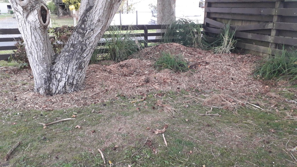 When a neighbour had a tree trimmed by an arborist recently I made the effort to ask him for an idea of what it would cost to take down our massive cedar tree, even though we were in the busy process of getting ready for morning school drop off. The Husband and I had been discussing it, what with the big storm we had. The arborist’s answer was somewhere in the vicinity of ‘oh dear’. Like, at the dark end of ‘oh dear’. That landed that on the shelf of ‘If God wants us to do it he’ll have to make a way because we can’t’. However, the good part was that he offered me free mulch on account of noticing that some gardening effort was going on here. And so it was that I found myself marveling at a pile of about two cubic meters of mulch in my front garden. Oh, precious, prized mulch! I wanted to throw it in the air and exclaim, “I’m rich! I’m rich!” But I did not, mostly because it was in the front garden. I am so thankful for the mulch. God knows I need it but haven’t had the means to go and get it myself. The whole garden needs mulch. When The Little Fulla came home he helped me to spread some out over the Walnut Garden. Some has been put elsewhere and there is more to be moved. The Little Fulla climbed on the pile and excitedly made himself a seat in it and threw some around, then wondered why he had sharp bits in his pants. See, that’s why I didn’t throw it around…
