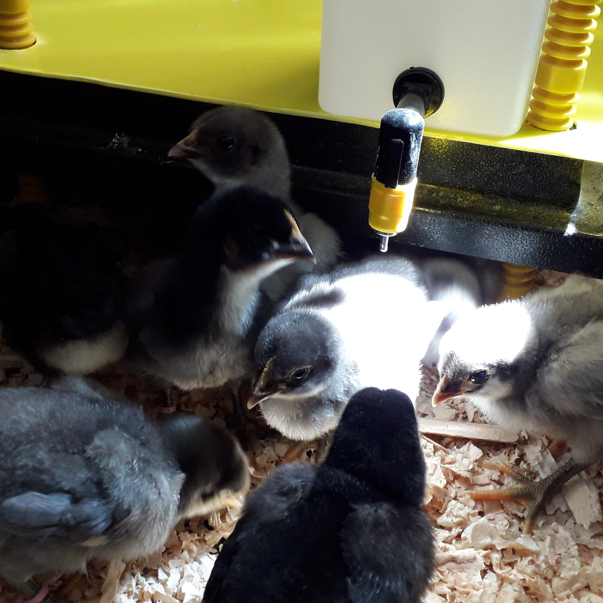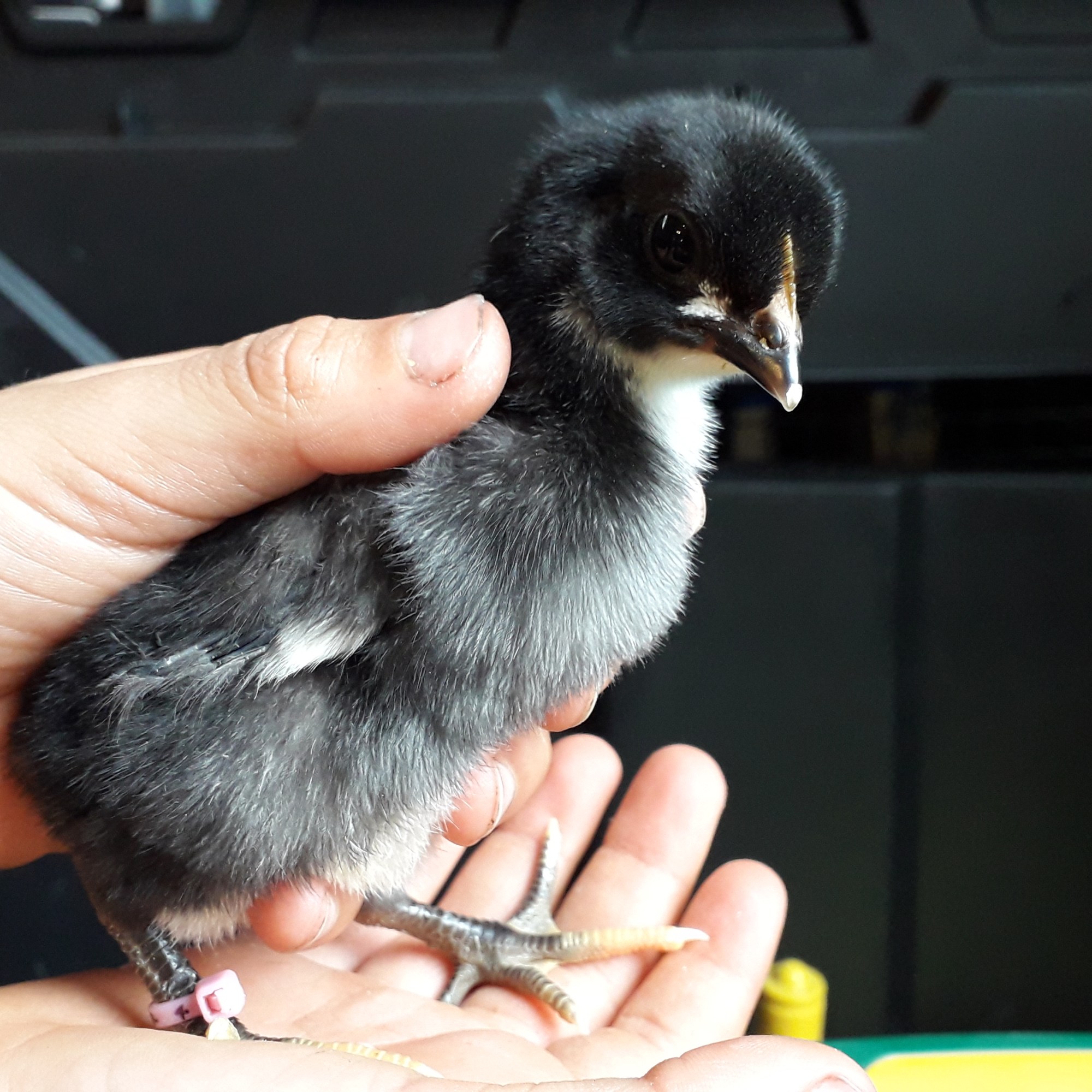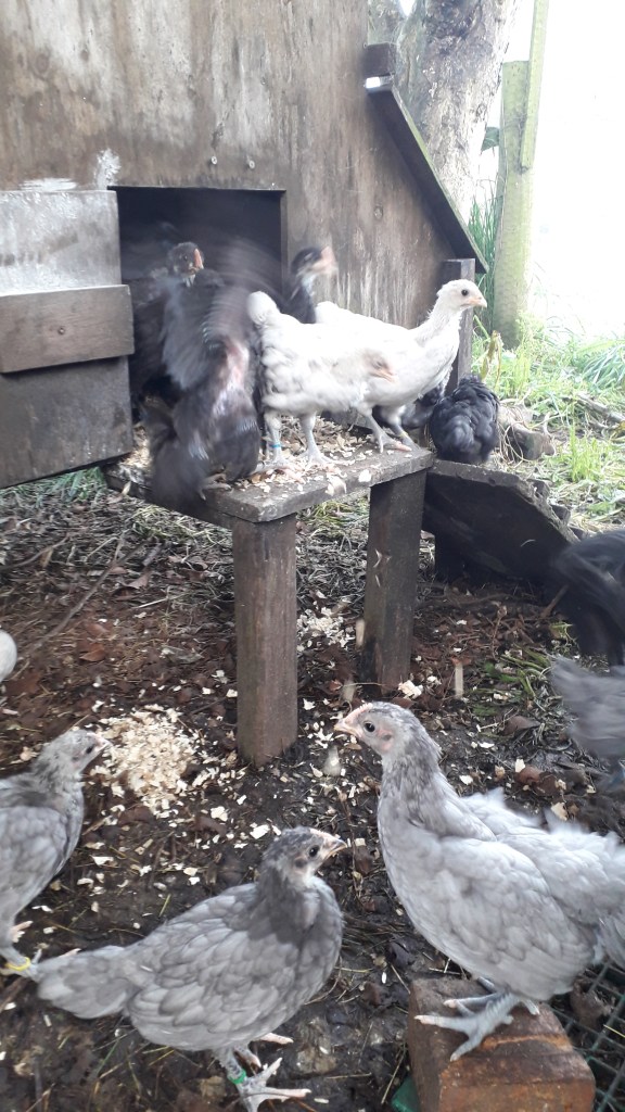 The second batch of chicks are two weeks old. Of the eggs that went into lockdown, 24 out of 26 hatched and everyone has been enjoying the little fluffies, especially The Little Fulla. We have one splash chick, 11 blue chicks and 12 black chicks. They are outside in the big cage now. We also have a few more arrivals, which I will talk about next time.